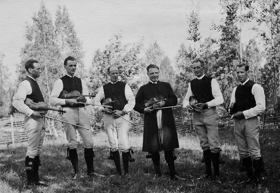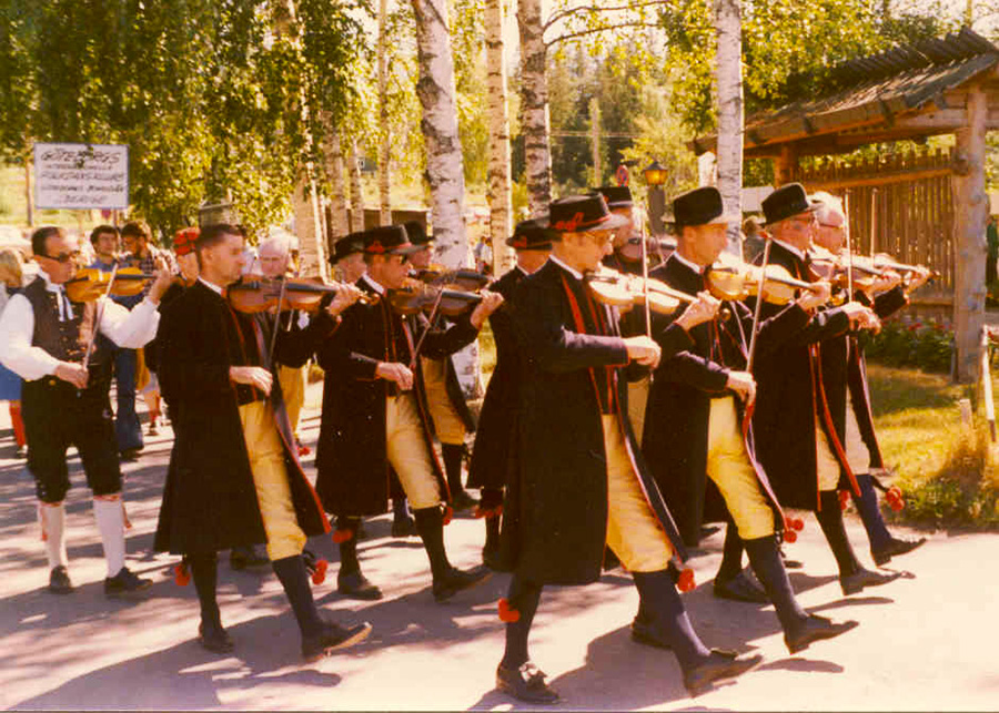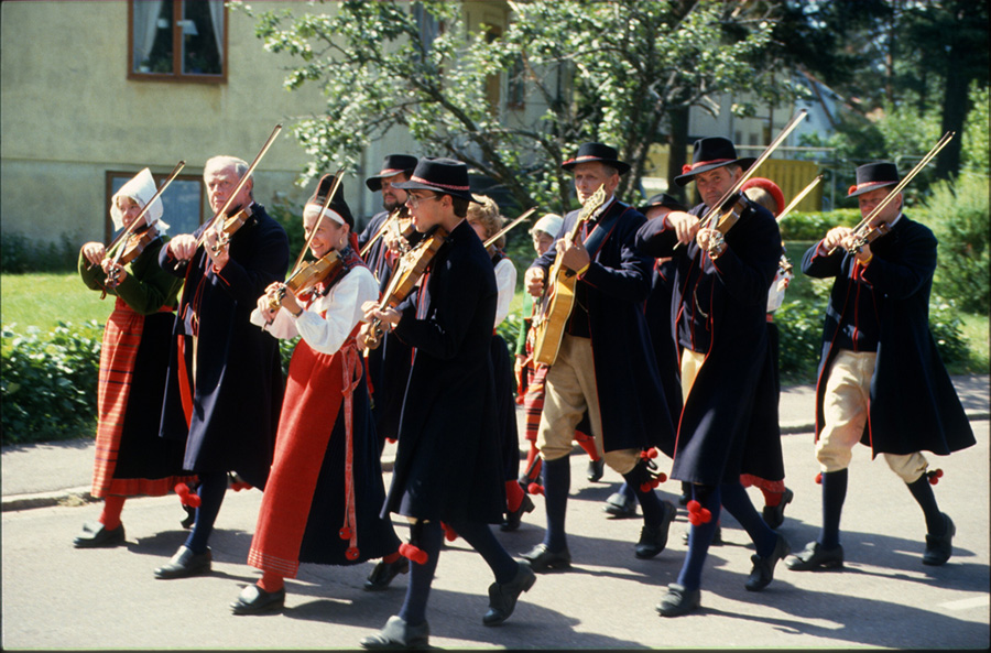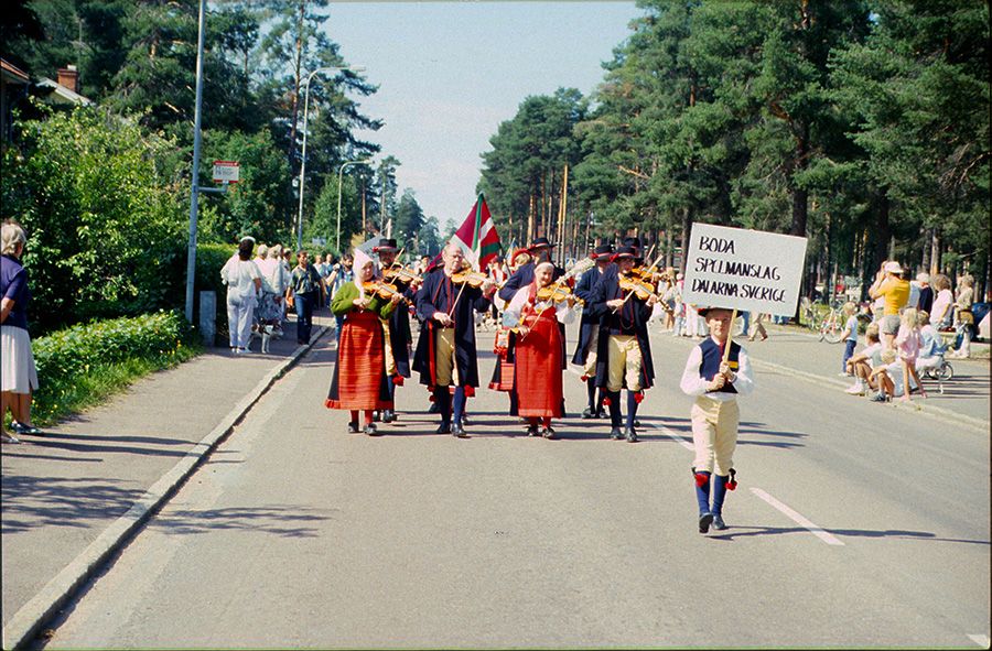 Varje midsommar träffas vi på kyrkvallen för att gå i täten för festtåget upp till Boda Gammelgård och sedan spelar laget till dans på logen.